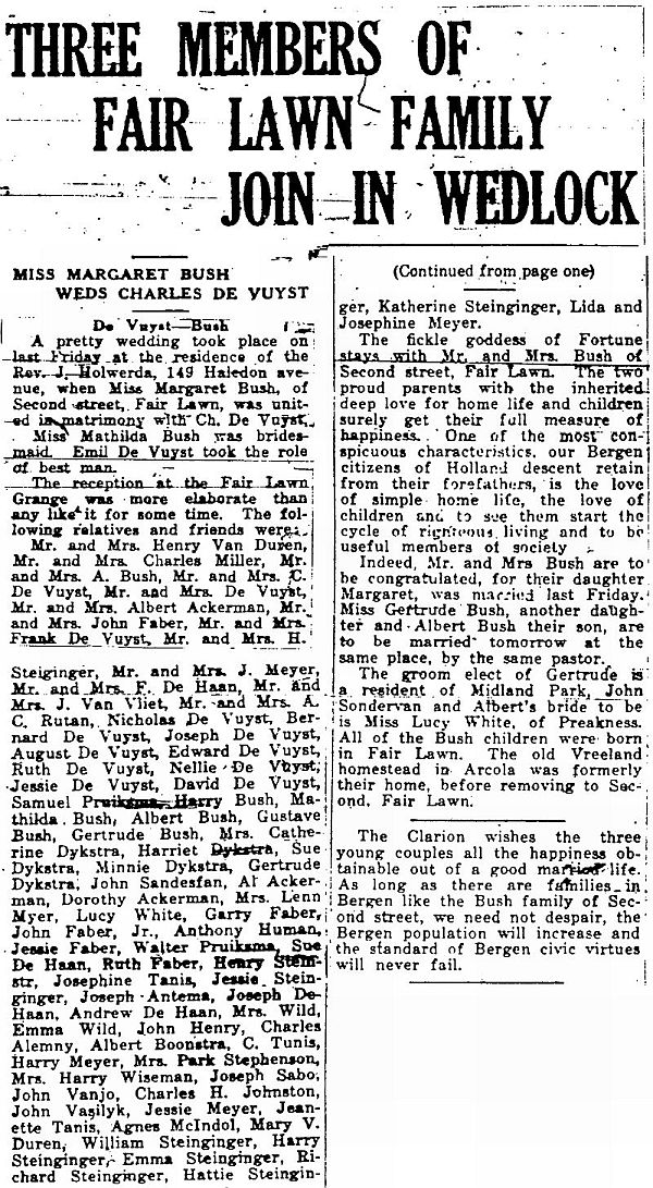 Report Bush Wedding. Fair Lawn Paramus Clarion, 3 Dec 1926, pg. 1, 4
