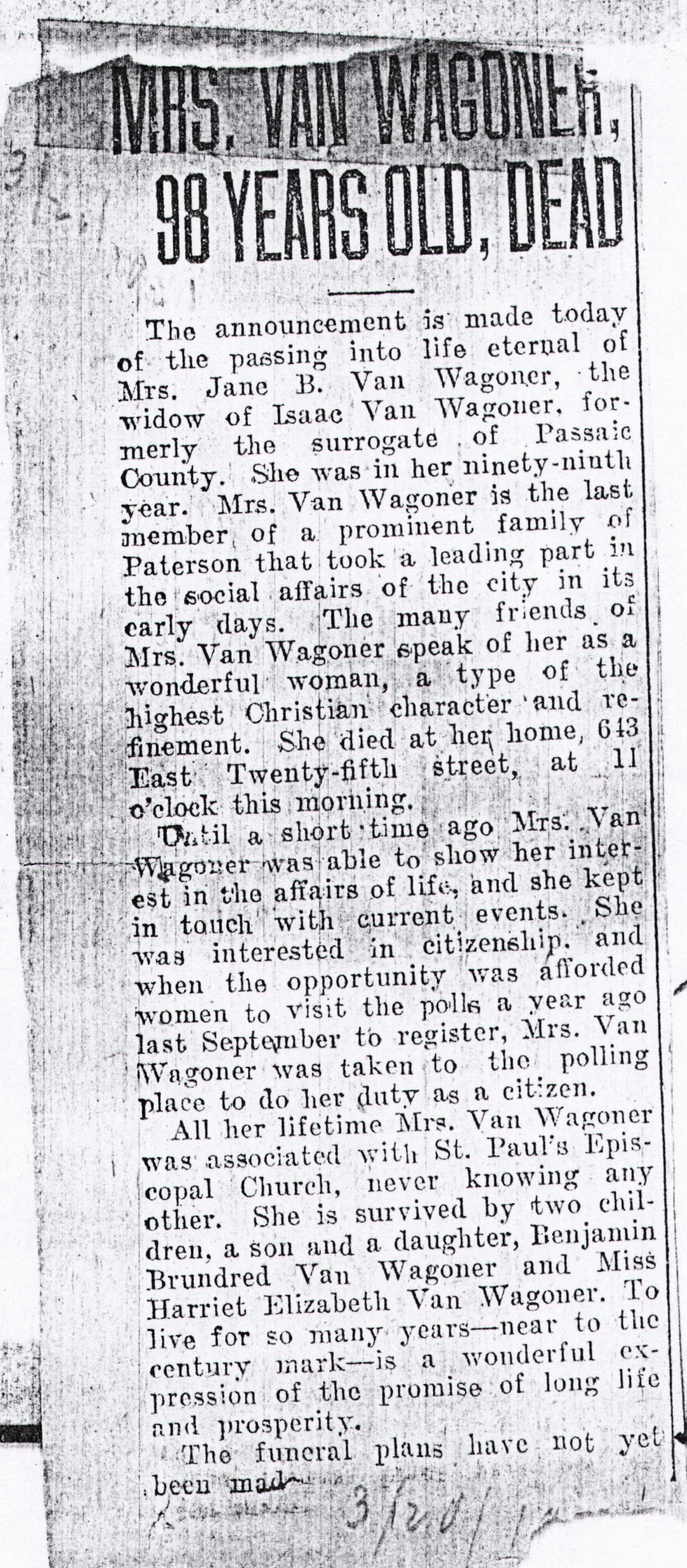 Obituary of Jane Bundred Van Wagoner, probably from one of the Paterson Papers