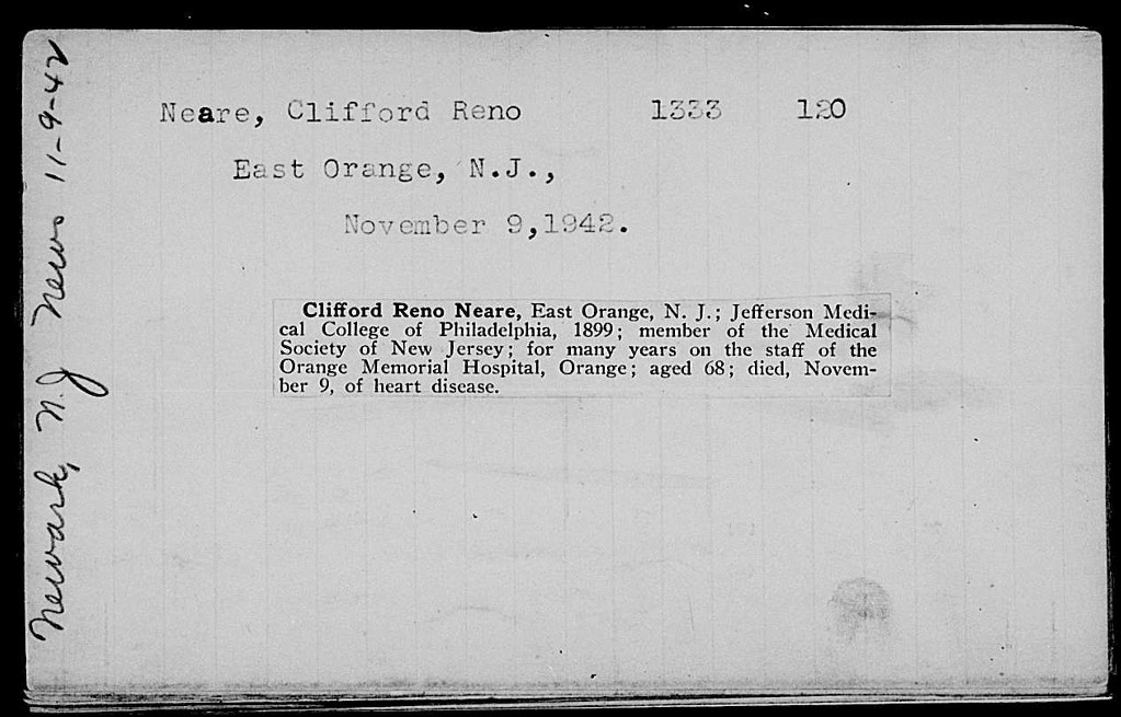 "United States, Deceased Physician File (AMA), 1864-1968", FamilySearch (https://www.familysearch.org/ark:/61903/1:1:WH6K-9P6Z : Mon Oct 07 20:48:38 UTC 2024), Entry for Clifford Reno Neare, 9 Nov 1942.
