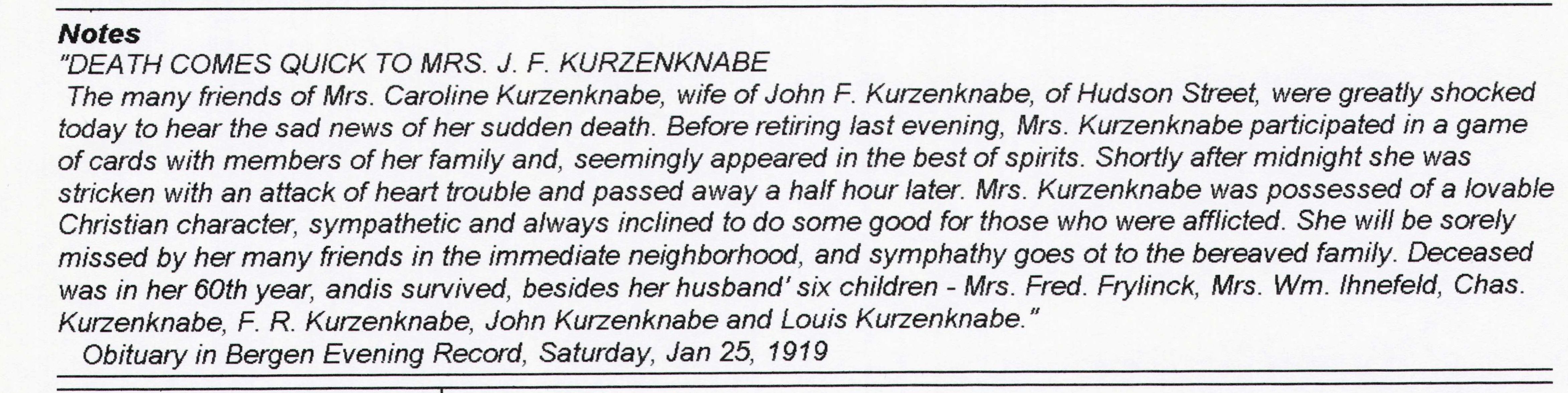 Transcipt of the obituary in the Bergen Evening Record