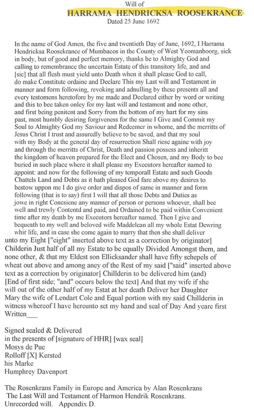 Transcription of will of Harrema Hendricksa Roosekrance, 25 Jun 1692