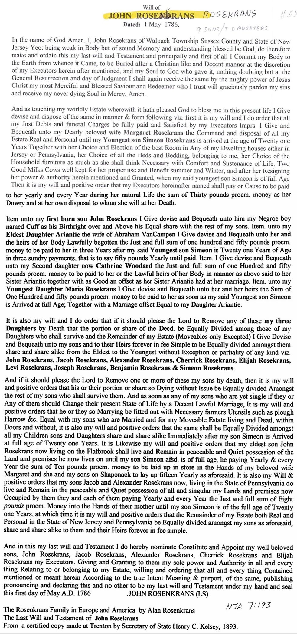 Transcription of will of John Rosekrans, 1 May 1786