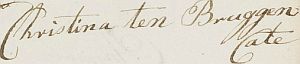 Christina ten Bruggencate was born in 1777 in Vriezenveen.1 Christina was baptized on 6 Jul 1777 in Vriezenveen.3 She married Jan Lammerink1 (banns 27 Oct 1809, Amsterdam. He was widower of Eva Landkamp, and showed the death certificates of his parents Hendrik Lammerink and Hendrina Eibbels; she showed the death certificates of her parents Barend ten Bruggencate and ? Schoemaker).1
