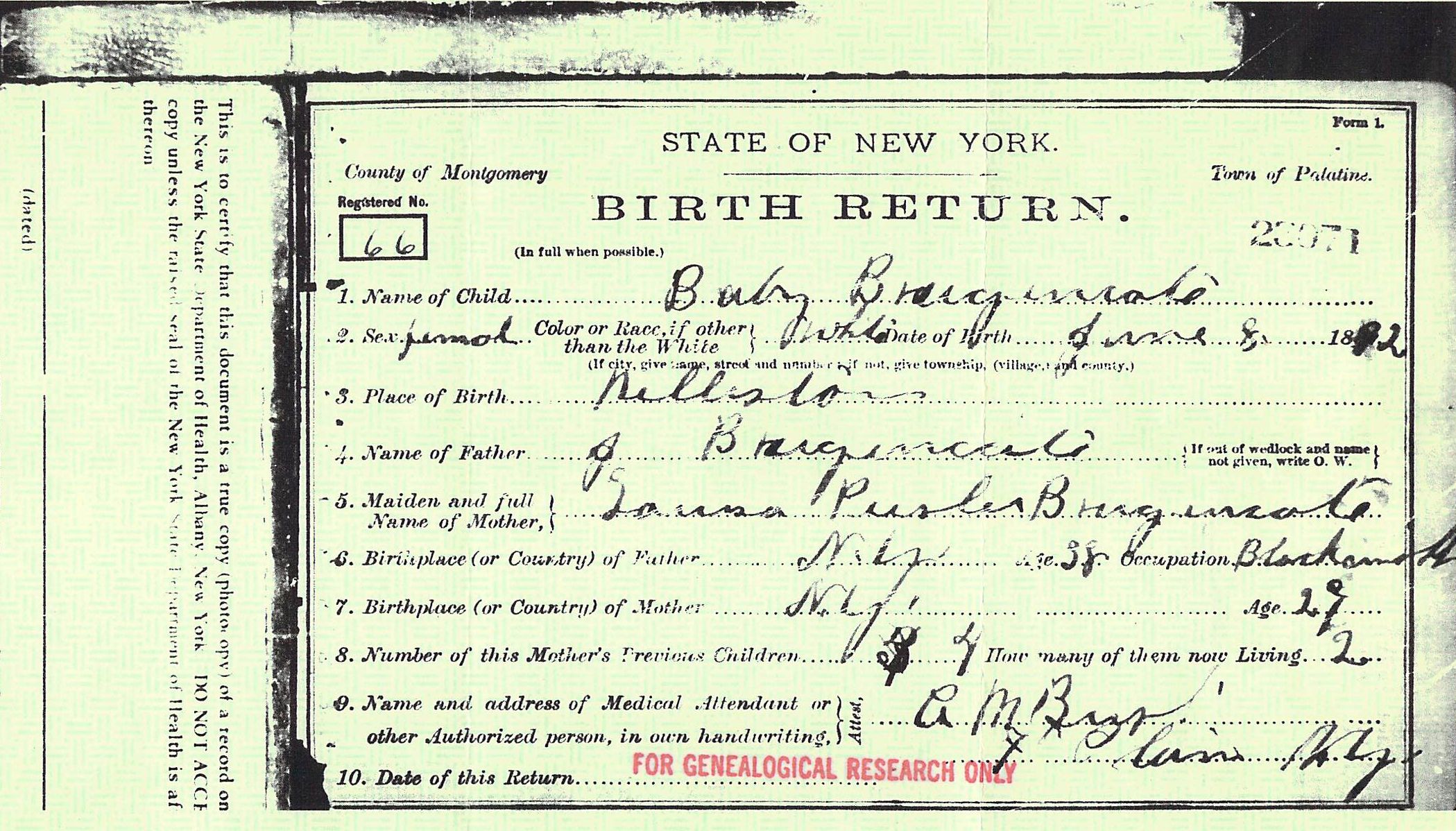 Birth Certificate New York, Montgomery County, Nelliston. Irene Helen Bruggencate, 8 Jun 1892