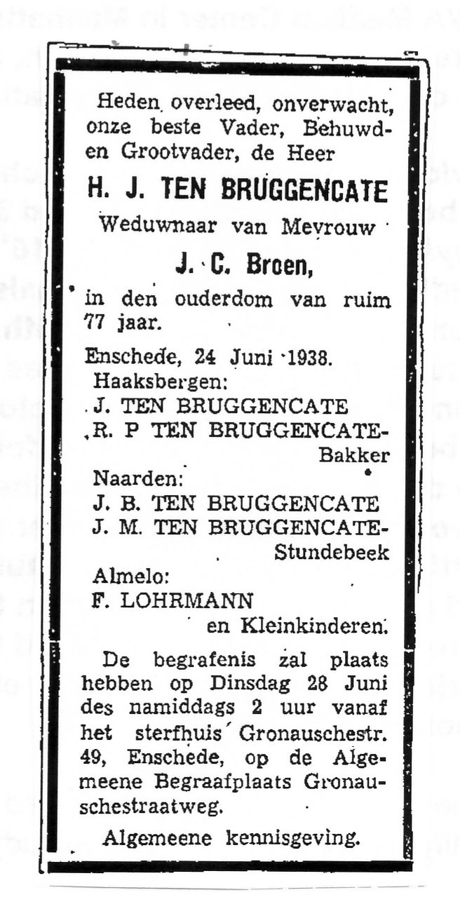 Unknown newspaper, overlijden H.J. ten Bruggencate, 1938