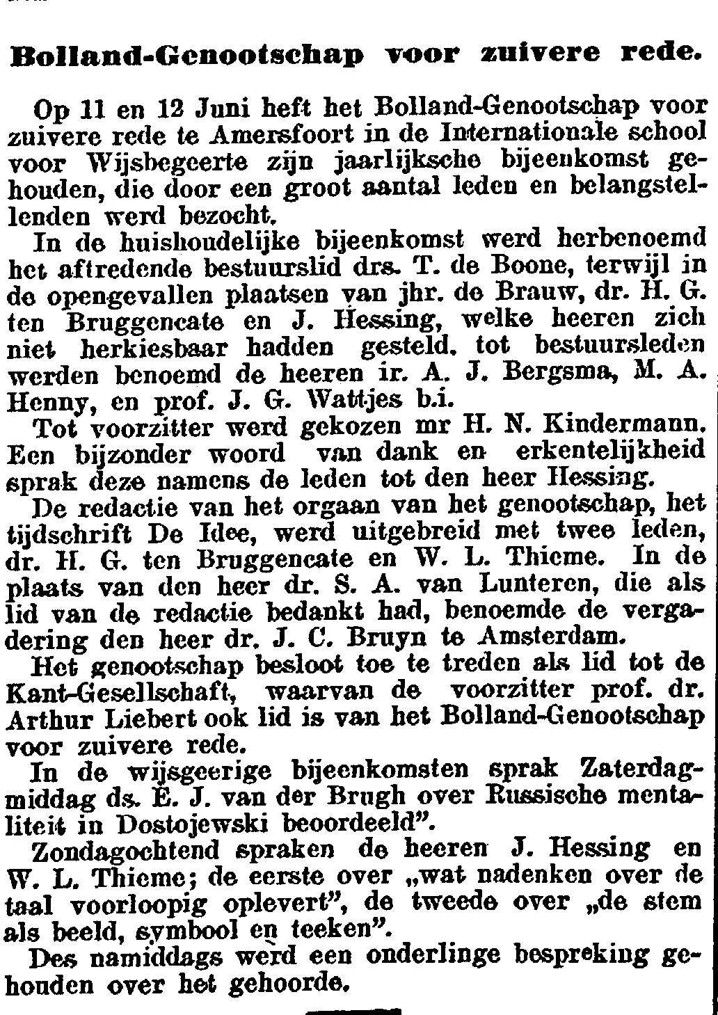 Artikel over het "Bolland Genootschap", waarvan H. G. ten Bruggencate lid was. NRC 14 Jun 1927 Ochtendblad A, pg 4