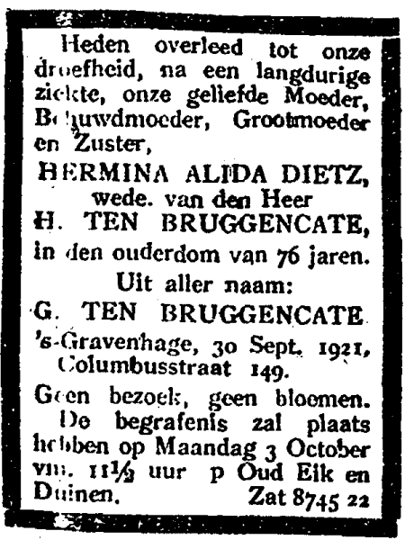 Overlijdensadvertentie van Hermina Alida Dietz. Het Vaderland, 1 Oct 1921, Avondblad B, pg 4