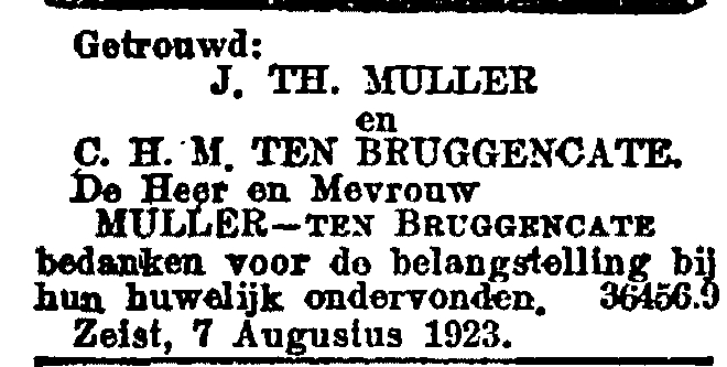 Huwelijksadvertentie van J. Th. Muller en C. H. M. ten Bruggencate, NRC, 8 Aug 1923 Ochtendblad A, pg 2