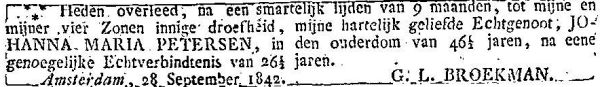 - [S3] Overlijden Johanna Maria Petersen, 28 Sep 1842, Amsterdam. Familieberichten op Microfiche.
